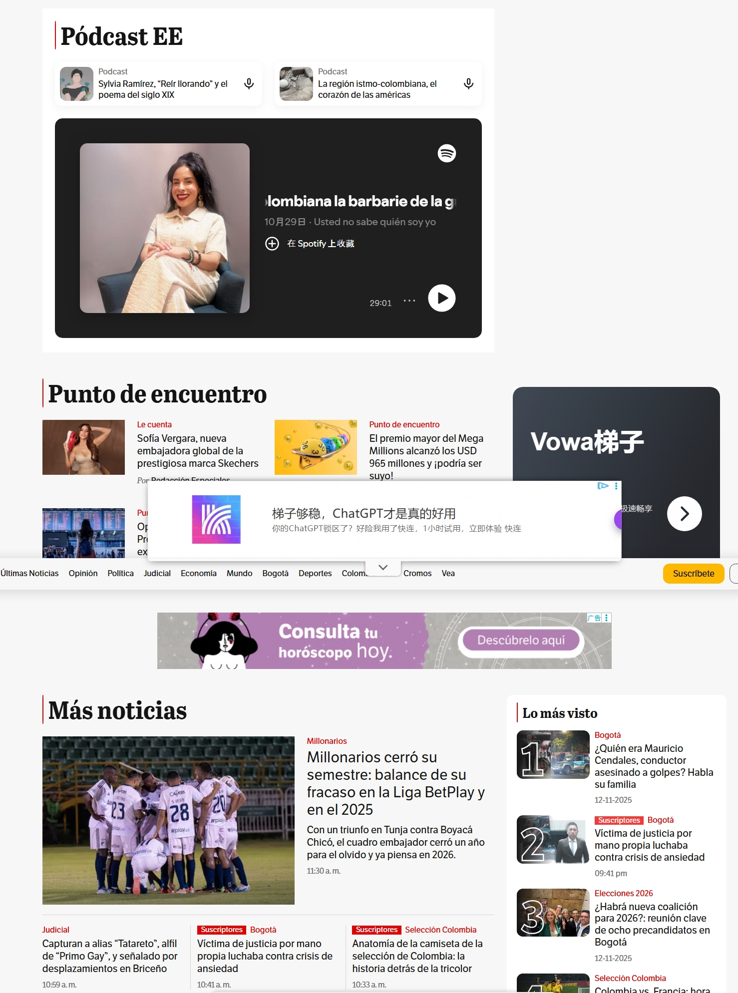 El Tiempo 是哥伦比亚历史最悠久、影响力最大的主流报纸之一,其官方网站作为该品牌的数字延伸,汇集了新闻报道、评论分析、专题调查、多媒体内容等全方位资讯服务。该网站内容覆盖国内政治、国际事务、经济、社会、体育、娱乐、文化与科技等多个领域,是哥伦比亚用户获取每日新闻与舆论观点的重要入口。